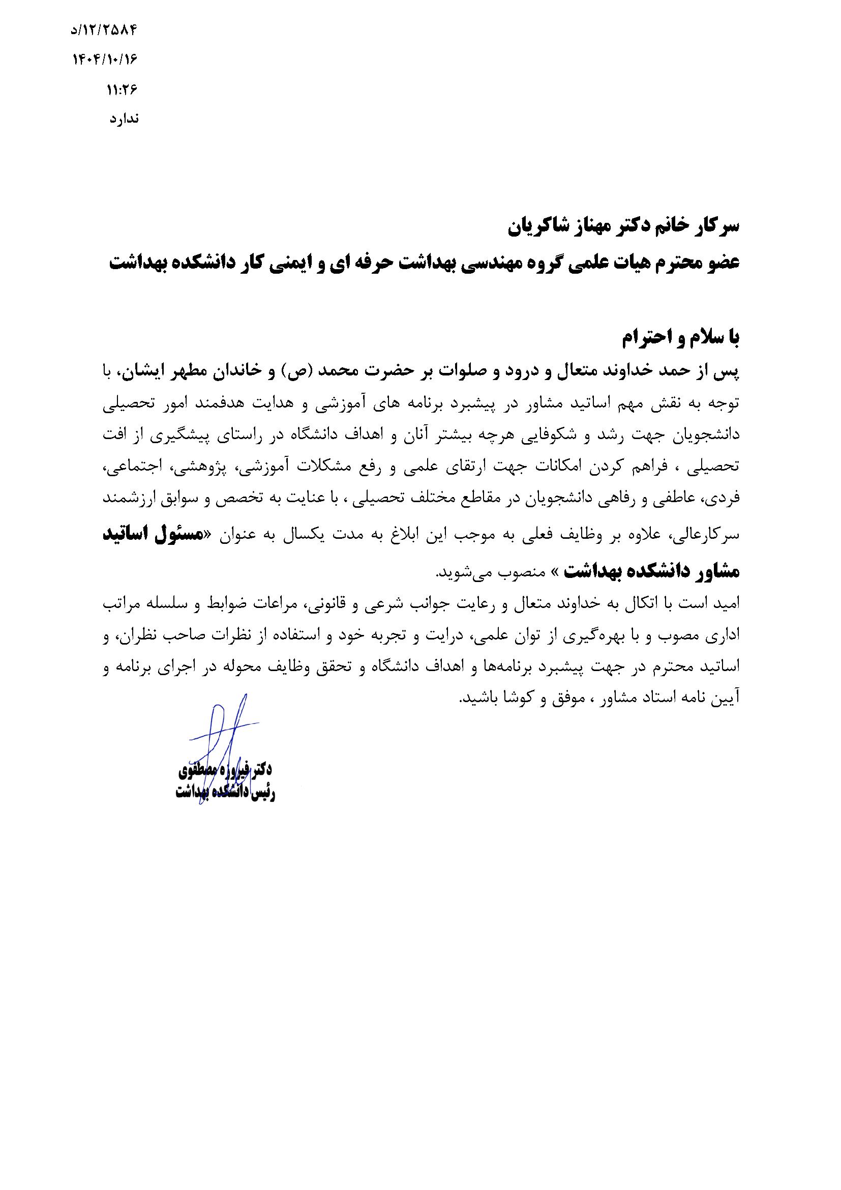 انتصاب استاد مشاور دانشکده بهداشت اصفهان